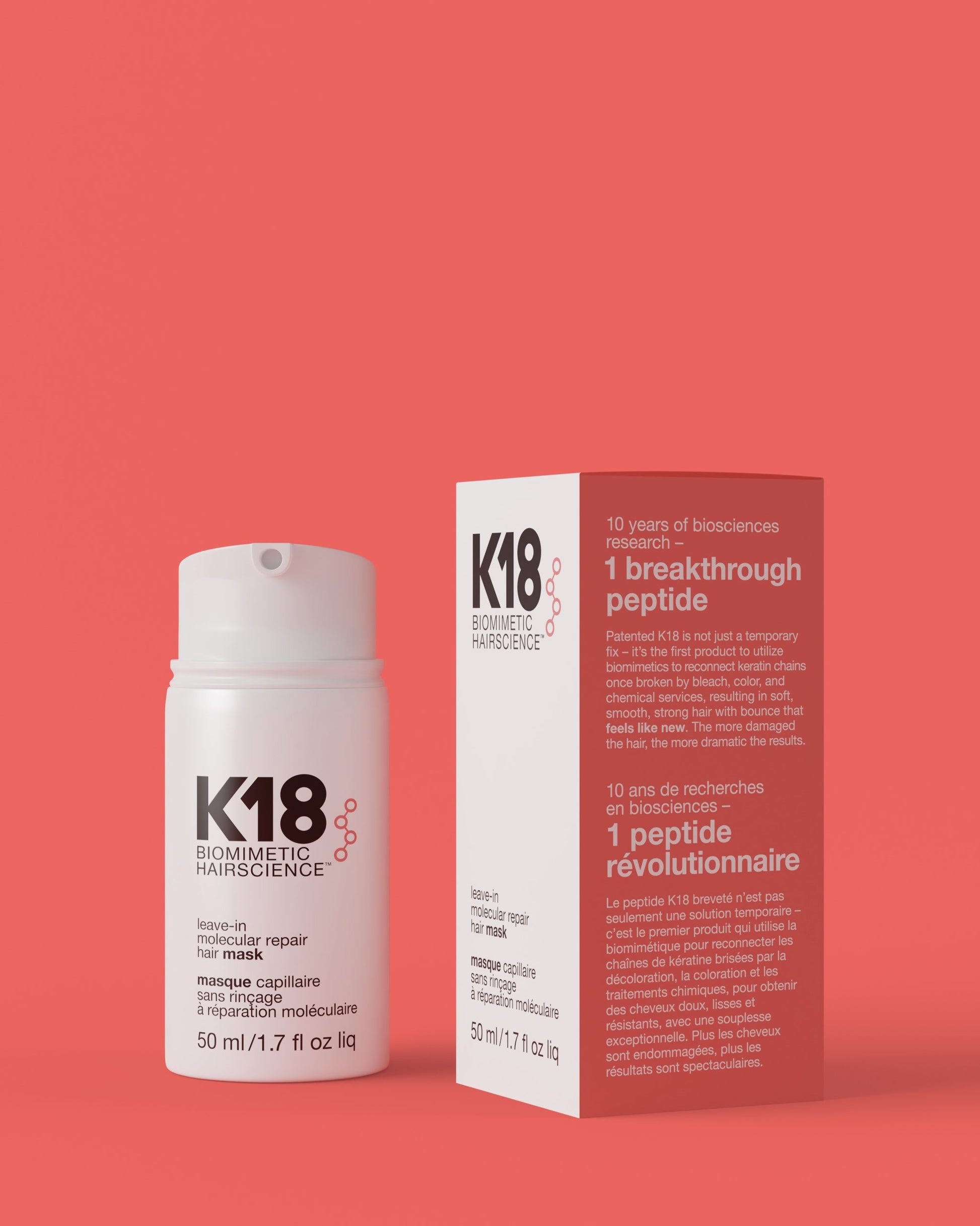 K18PEPTIDE™ es un péptido desarrollado por la biotecnología que imita la estructura del cabello para revertir el daño al volver a conectar las cadenas polipéptidos y los enlaces de disulfuro rotos durante la decoloración, color o los servicios químicos + calor*.